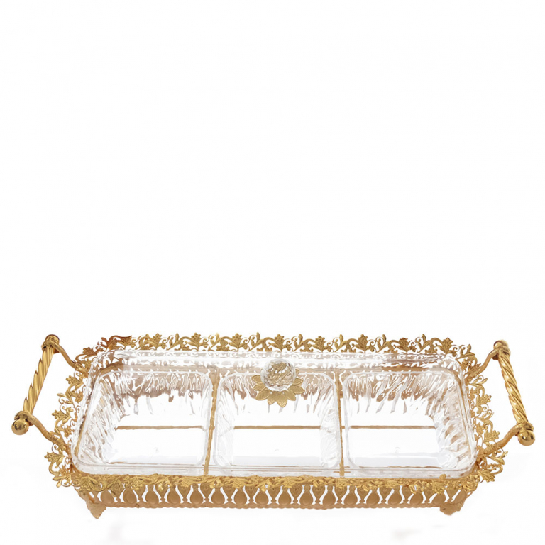 This gold three part container has beautiful, simple and very elegant ornaments. This gold glass container is ideal for storing small components, beads, stones, food, or other small items.