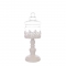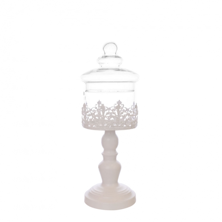 It’s made of clear glass. The cake lid curves down and has a round handle on it so it's easy to hold.