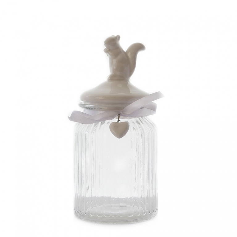 This beautiful and classical glass jar with ceramic squirrel top. This is simple and understatedly cute. A jar for home decor, office decor, special gift or candy place.